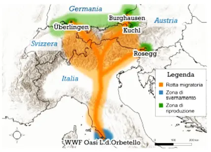Attualmente si calcola siano circa 230 individui tra Austria e Italia, più altri 50 in Spagna. Da qualche anno infatti alcuni scelgono di migrare verso l’Andalusia (anche se il percorso è quasi tre volte più lungo), dove fino alla fine del secolo corso esisteva una colonia stanziale di circa 300 esemplari. La scelta del nuovo percorso potrebbe derivare dalle difficoltà nel superare le Alpi. Forse per i cambiamenti climatici, partono non in settembre ma anche 40 giorni dopo, quando non ci sono più le condizione favorevoli, tra cui le termiche grazie alle quali superano le alte montagne.