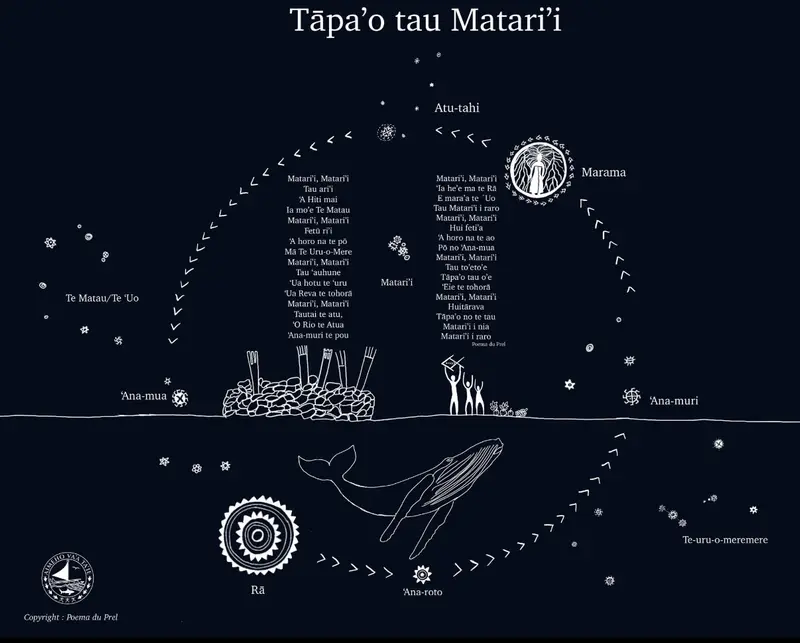 Prima di Matari’i i nia, per accogliere l’evento, si strappano le erbacce dai marae, i luoghi dedicati al culto, e si resta in attesa di questo evento spazio temporale, ci si appresta a ricevere gli déi legati a questa costellazione che arriveranno silenziosi nel cielo: con gli antenati che si avvicinano alle vite dei vari discendenti.