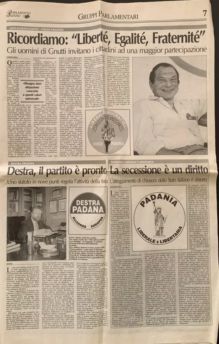 In effetti anche noi vecchi etnisti – che mai per un attimo nei decenni abbiamo considerato la Lega Nord un possibile traghetto verso l’autodeterminazione – almeno un aspetto positivo lo vediamo in una intuizione del periodo bossiano, il Parlamento della Padania. È sempre Cuoreverde a ricordarmelo nella sua lettera personale, rafforzando la mia antica certezza che un movimento autonomista o indipendentista non debba mai avere una connotazione “politica”, nel senso di ideologie o, come si dice, di simpatie a “destra” o sinistra”. Questo per almeno due motivi ovvi: primo, un gruppo etnico è fatto da una popolazione i cui singoli individui hanno idee diverse, e tu lo stai difendendo nel suo complesso; secondo, non devi costringere una persona a scegliere tra l’autodeterminazione e la sua convinzione politica.