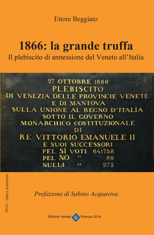 È uscito come terza edizione – ma grazie alle numerose integrazioni avrebbe potuto essere un libro a sé stante – 1866: LA GRANDE TRUFFA. Il plebiscito di annessione del Veneto all’Italia, di Ettore Beggiato, Editrice Veneta. Si tratta del resoconto, storicamente inappuntabile, di una votazione falsa e manipolata che ha rappresentato la fine della gloriosa indipendenza veneta. Riportiamo la prefazione al libro del professor Sabino Acquaviva, un modo per introdurre al meglio il saggio e ricordare questo illustre sociologo – grande difensore dell’identità veneta – che è scomparso lo scorso dicembre all’età di 88 anni.