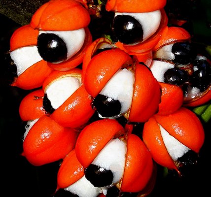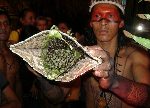 Consumata come bevanda rituale, la pianta dovrebbe ispirare le parole che creano l’armonia tra le idee, i desideri e le intenzioni dei partecipanti al convivio. Si tratta di una liana legnosa della famiglia delle sapindaceae che nella foresta raggiunge altezze di oltre 12 metri. I semi, spolpati e torrefatti in un forno d’argilla, sono artigianalmente trasformati in bastoni e poi grattugiati, mescolati con la manioca e disciolti nell’acqua. Per l’alto contenuto di caffeina, il seme di guaranà è ricco di fosforo, potassio e vitamine B1, B2, PP ed E. È uno stimolante di cui i cacciatori Sateré Mawé non possono fare a meno, prima di iniziare una battuta. Inoltre è fondamentale nei rituali, in particolare in quello della tucandeira.