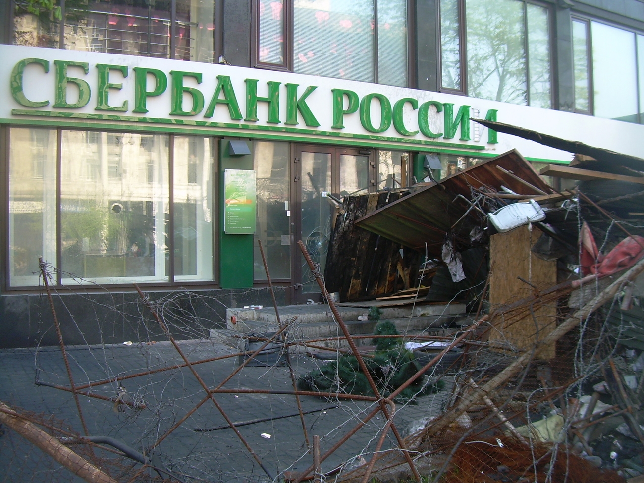 In Piazza Maidan il nuovo che avanza fa già bella mostra di sé. All’angolo destro del Khreshchatyk, in direzione di piazza Europa, dove sorgeva la banca russa Sberbank ora ci sono le nuovissime insegne luminose bianco-verdi della Dnipro Credit Bank. Il palazzo dei sindacati, incendiato dai berkut durante gli scontri e non ancora ristrutturato, è invece completamente ricoperto da un rivestimento colorato sopra il quale campeggia la scritta “Viva l’Ucraina, Viva gli Eroi”, sullo sfondo di un cielo azzurro color pastello e di una ridente terra rappresentata con le bionde spighe di grano dei campi ucraini.